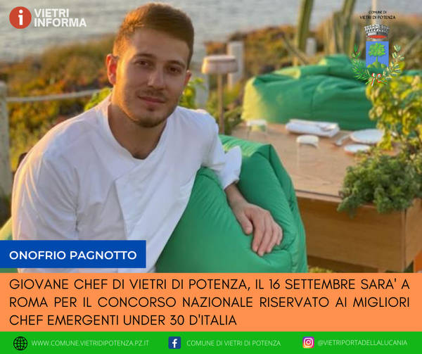 Onofrio Pagnotto, 22 anni di Vietri di Potenza, il 16 settembre sarà a Roma al Teatro delle Esposizioni, per partecipare al concorso riservato ai migliori Chef emergenti Under 30 di ogni singola regione d’Italia.
