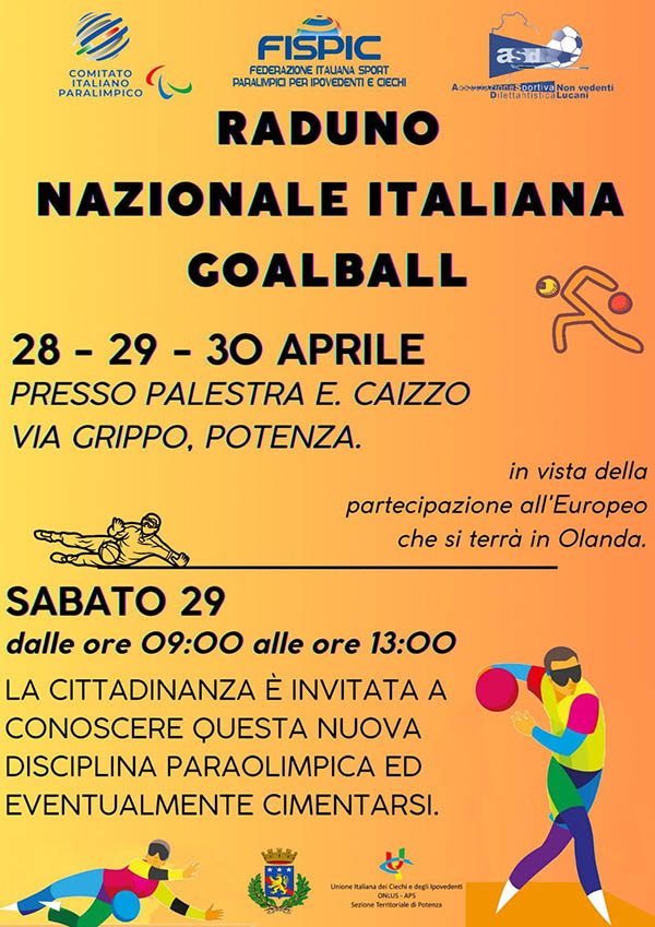 Sabato 29 Aprile dalle ore 9:00 alle 13:00 sarà possibile cimentarsi in una partita dimostrativa di goalball presso la palestra Caiazzo di Potenza, che ospiterà per la prima volta il raduno della nazionale italiana dal 28 al 30 Aprile in vista della partecipazione al campionato europeo.