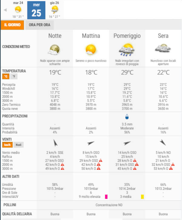 Secondo gli esperti di 3bmeteo, domani, Mercoledì 25 Agosto, avremo cielo sereno o poco nuvoloso al mattino, nubi irregolari con rovesci di pioggia il pomeriggio, cielo nuvoloso con locali aperture la sera.
