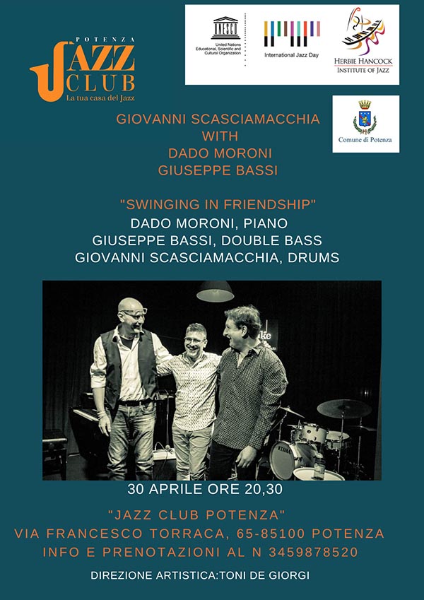 Domenica 30 Aprile per l’International Jazz Day, il Jazz club Potenza in collaborazione con il Comune di Potenza presenta: Giovanni Scasciamacchia with Dado Moroni e Giuseppe Bassi “SWINGING IN FRIENDSHIP”.