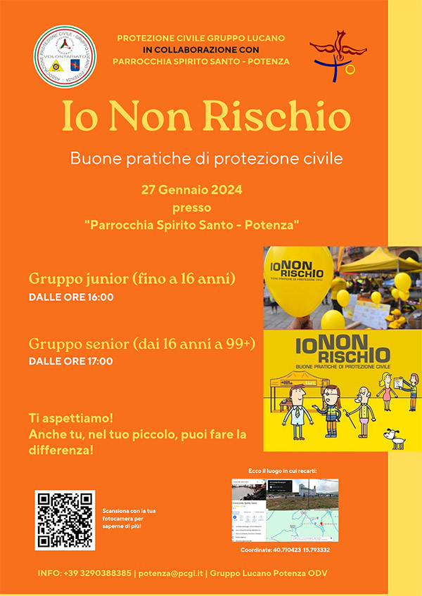 I ragazzi del Servizio Civile Universale di Potenza, in collaborazione con la Protezione Civile – Gruppo Lucano Potenza sono lieti di annunciare l’evento “IoNonRischio365” che si terrà il 27 Gennaio nella Parrocchia Spirito Santo situata in Località Lavangone (PZ).