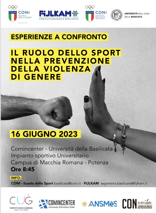 È in programma per venerdì 16 giugno 2023, con inizio alle ore 08:30, un convegno dal titolo “Il ruolo dello sport nella prevenzione della violenza di genere”, organizzato dalla FIJLKAM Basilicata (Federazione Italiana Judo Lotta Karate Arti Marziali) e patrocinato dal CONI Basilicata e dalla sua Scuola Regionale dello Sport.