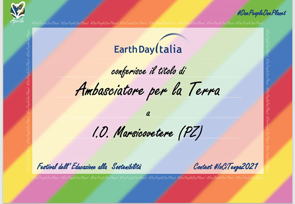 La Scuola dell’infanzia dell’Istituto Omnicomprensivo di Marsicovetere (PZ) ha partecipato alla VII edizione del Contest “Io Ci Tengo”, avvenuta nell’ambito del Festival dell’Educazione alla Sostenibilità che si svolge ogni anno in occasione dell’Earth Day Italia, acquisendo il premio “Ambasciatore per la Terra 2021”.