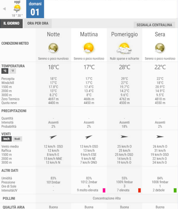 Domani martedì 1 Agosto avremo cieli in prevalenza poco nuvolosi, salvo variabilità nelle ore centrali della giornata, non sono previste piogge.