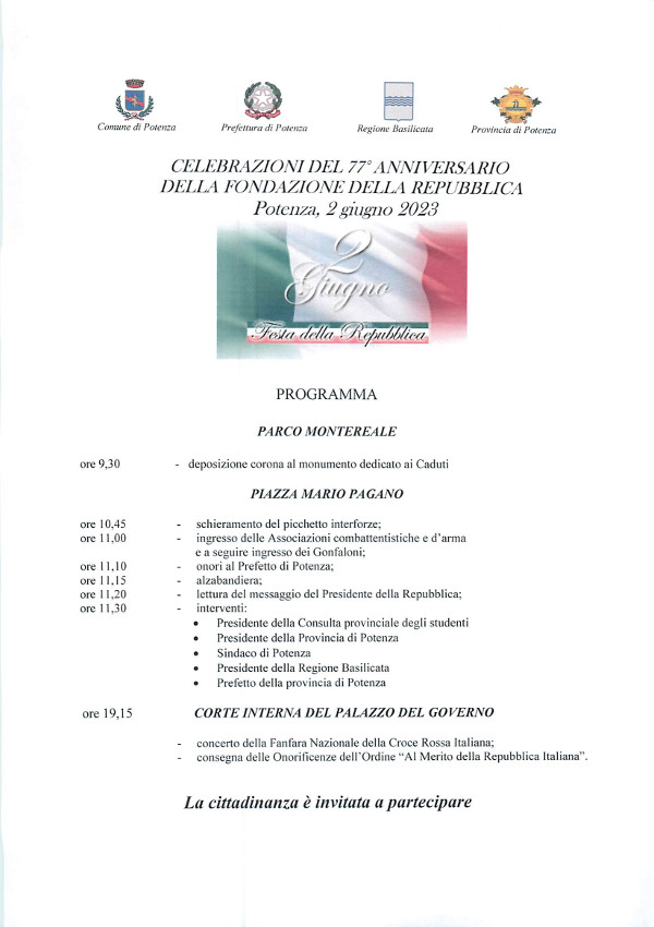 Venerdì 2 giugno prossimo, in occasione del 77° Anniversario della Fondazione della Repubblica, la Prefettura di Potenza ha organizzato un programma ricco ed articolato.
