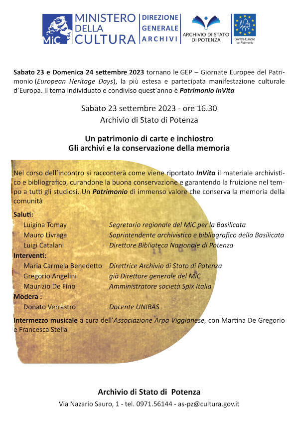In occasione delle Giornate Europee del Patrimonio 2023 l’Archivio di Stato di Potenza è lieto di invitare la cittadina all’incontro che si terrà il giorno 23 corrente mese alle ore 16.30 nella sala conferenze dell’Istituto in Via N. Sauro,1.