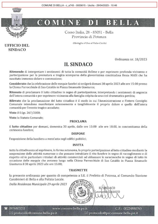 “In segno di cordoglio e per esprimere vicinanza e partecipazione per l’improvvisa, prematura e triste scomparsa della cara Ilenia MASI, il Sindaco Leonardo SABATO ha proclamato il LUTTO CITTADINO dalle ore 15:00 alle ore 18:00, in concomitanza della cerimonia funebre che avrà luogo domani, Domenica 30 aprile, alle ore 15:00, presso la chiesa Santa Maria Assunta Regina in Cielo di San Cataldo (Chiesa del Villaggio)“.