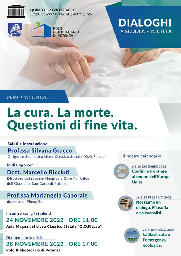 Ne parleranno il dottor Ricciuti, direttore del reparto Hospice e delle Cure Palliative, e la professoressa Caporale, docente di Filosofia.