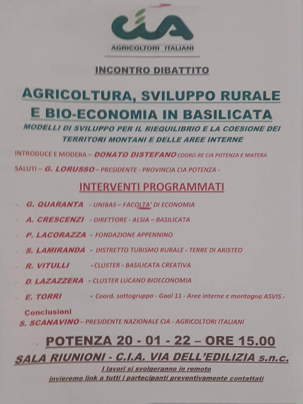 Il workshop, introdotto e moderato da Donato Distefano, dopo i saluti di Lorusso, presidente Cia Potenza, prevede interventi programmati di: