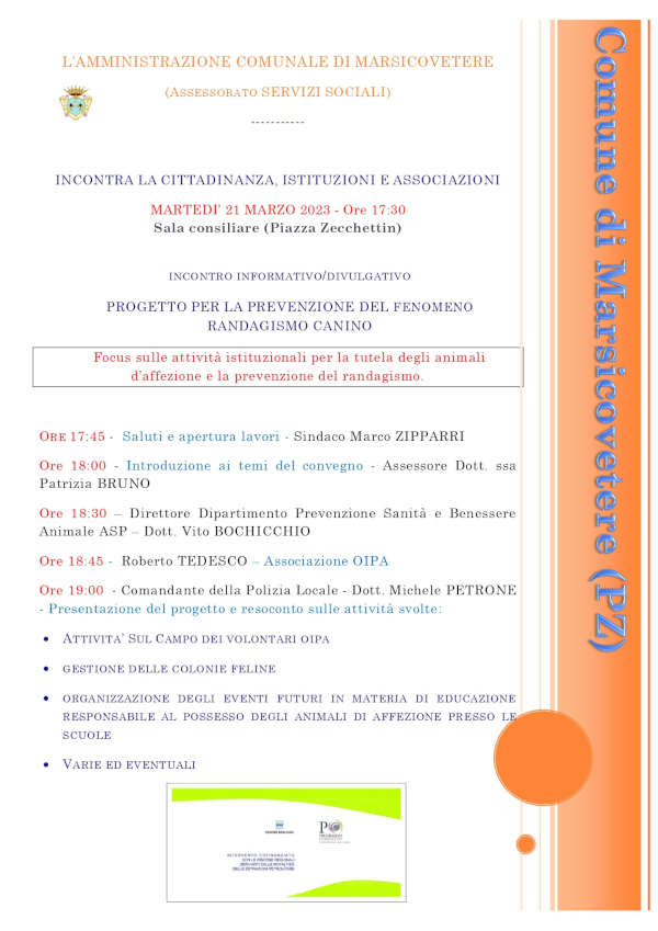 L’evento è organizzato dal Comune di Marsicovetere, Assessorato ai Servizi sociali, per offrire alla cittadinanza, alle istituzioni e alle associazioni un focus sulle attività istituzionali per la tutela degli animali d’affezione e la prevenzione del randagismo.