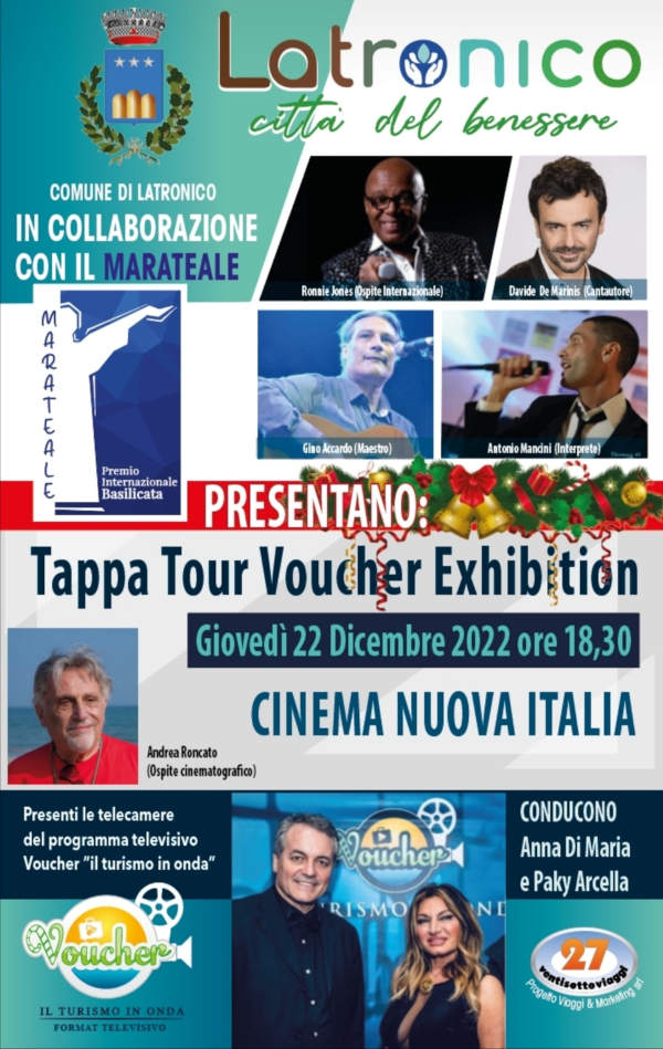 Nella splendida città di Latronico, in provincia di Potenza, si terrà, questa sera, giovedì 22 dicembre 2022, alle ore 18.30 , nel Cinema Nuova Italia, una tappa di “Voucher Exhibition”, in collaborazione con “Marateale” – Premio Internazionale della Basilicata –
