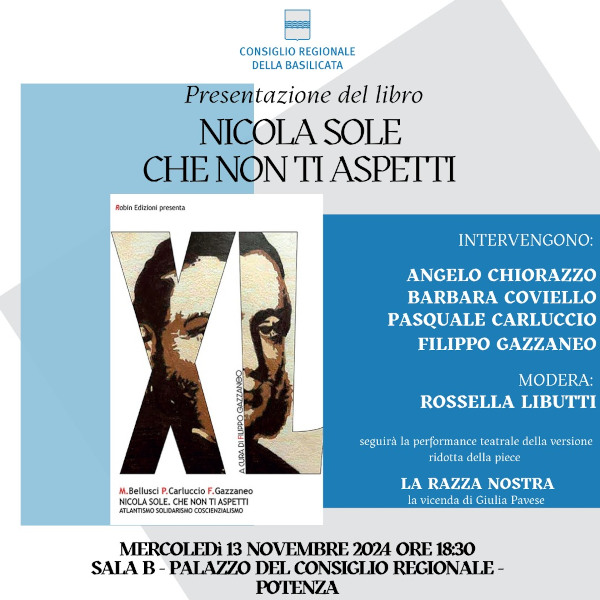 Si terrà Mercoledì 13 Novembre alle 18:30 nella sala B del palazzo del Consiglio Regionale, su iniziativa del Vice Presidente del Consiglio regionale Angelo Chiorazzo, la presentazione del libro “Nicola Sole che non ti aspetti. Atlantismo, Solidarismo, Coscienzialismo” di Maddalena Bellusci, Pasquale Carluccio e Filippo Gazzaneo edito da Robin Edizioni.