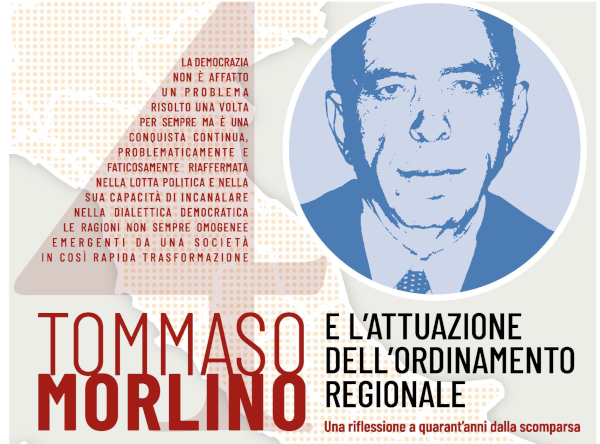 Venerdì 27 ottobre, alle ore 17:30, presso la Sala Gregorio Inguscio (Via Vincenzo Verrastro 9 – Potenza), si svolgerà un convegno su “Tommaso Morlino e l’attuazione dell’ordinamento regionale. Una riflessione a quarant’anni dalla scomparsa”.