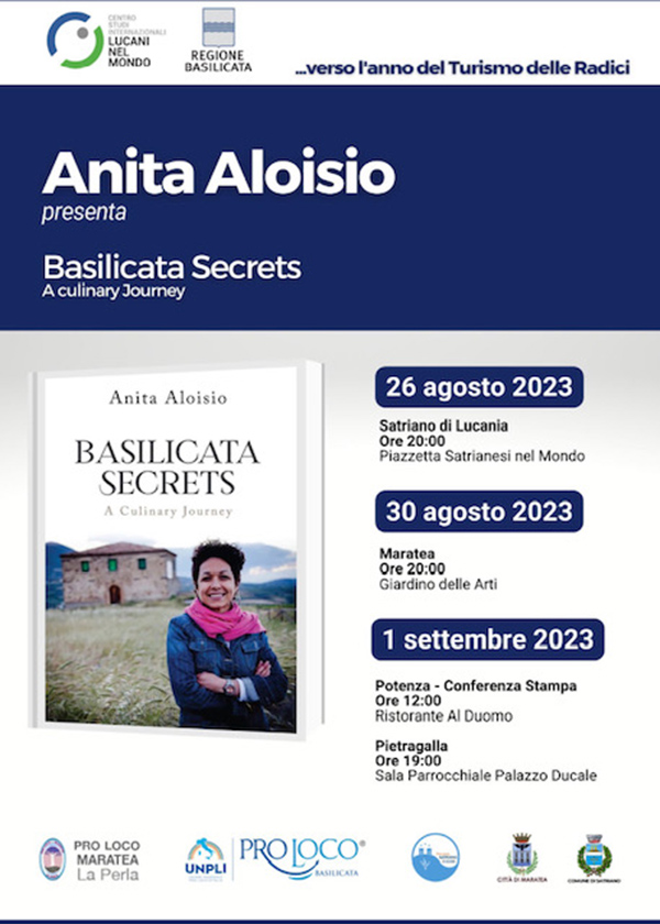 Con una serie di eventi promossi ed organizzati dal Centro Studi Internazionali Lucani nel Mondo, in collaborazione con la Regione Basilicata ed in programma dal 26 Agosto al 1 Settembre, sarà presentato in Basilicata, per la prima volta, la versione italiana del libro documentario “Basilicata Secrets – Diario Culinario”, scritto da Anita Aloisio, originaria di Muro Lucano e residente in Canada a Montreal.