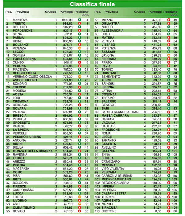 La nostra città infatti (in base alle 110 province prese in considerazione) quest’anno è risalita di quattro posizioni e adesso è ferma al 64esimo posto, rispetto al 68esimo del 2015.