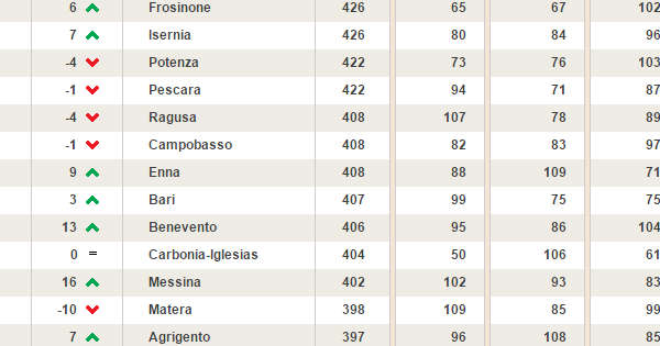 Potenza occupa l’80esima posizione, quindi in linea di massima si trova nella fascia media della classifica, perdendo quattro posizioni rispetto allo scorso anno.