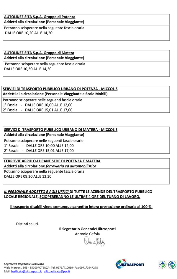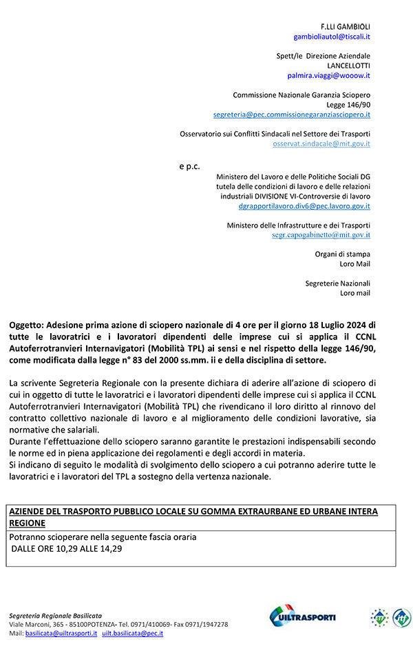 La scrivente Segreteria Regionale con la presente dichiara di aderire all’azione di sciopero di tutte le lavoratrici e i lavoratori dipendenti delle imprese cui si applica il CCNL Autoferrotranvieri Internavigatori (Mobilità TPL) che rivendicano il loro diritto al rinnovo del contratto collettivo nazionale di lavoro e al miglioramento delle condizioni lavorative, sia normative che salariali.
