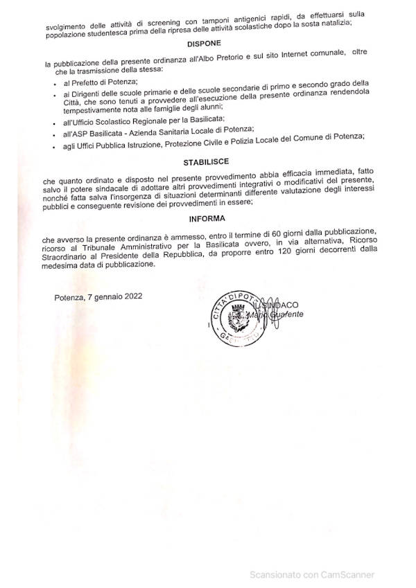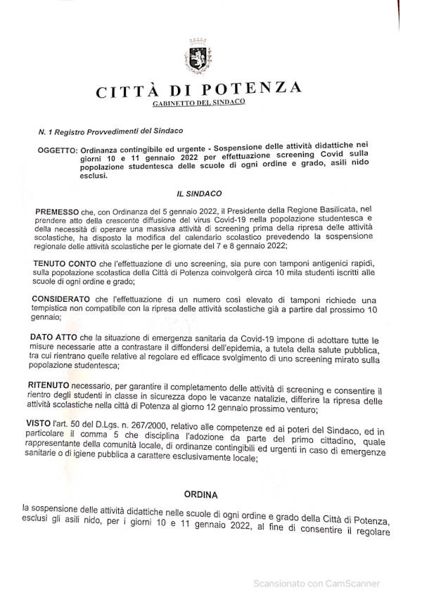 “Sospensione attività didattiche in tutte le scuole di ogni ordine e grado per i giorni 10 e 11 gennaio 2022“.