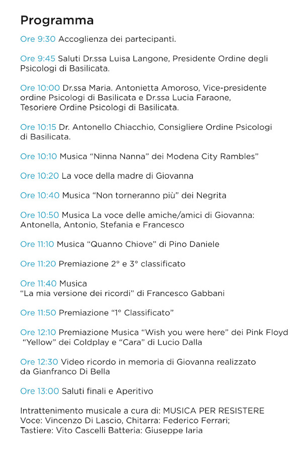 È con rinnovato sentimento che il prossimo sabato 9 dicembre, a partire dalle ore 9.30, nella sede di Potenza dell’Ordine degli Psicologi della Basilicata, in via della Chimica 61, che sarà celebrata la terza edizione del Premio, intitolato alla sua memoria.