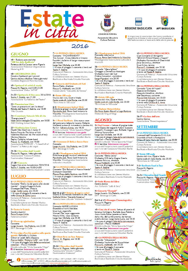 - 3 Agosto 2016: concerto “ RITMO LATINO ” Piazza Matteotti alle ore 20.30;10 Agosto 2016: “UNA VITA DI SCORTA” Largo S. Lucia alle ore 18.30;