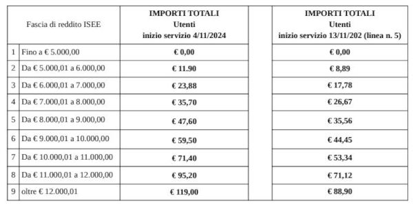 Importi utenti 1° Avviso inizio servizio 16/9/2024 (per viaggio di Andata e Ritorno 6 giorni a settimana).
