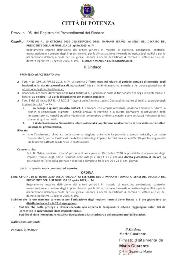 Il Sindaco di Potenza, con proprio provvedimento, ha stabilito: