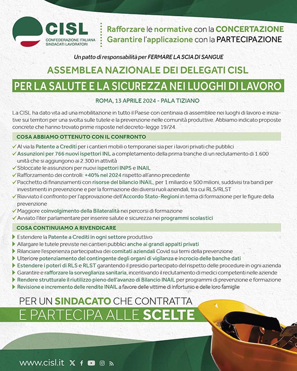 Una delegazione della Cisl Basilicata sarà a Roma, Sabato 13 Aprile, per partecipare all’assemblea nazionale delle delegate e dei delegati della Cisl per la salute e la sicurezza nei luoghi di lavoro.
