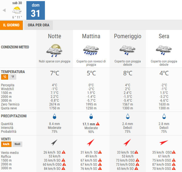 Domani, Domenica 31 Gennaio, avremo cieli molto nuvolosi o coperti al mattino con piogge e rovesci anche temporaleschi, in attenuazione dal pomeriggio.
