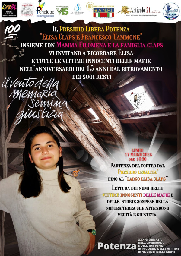Il Presidio Libera Potenza “Elisa Claps e Francesco Tammone”, insieme a Mamma Filomena e la famiglia Claps, invita tutta la cittadinanza a partecipare a un momento di memoria e riflessione per ricordare Elisa Claps e tutte le vittime innocenti delle mafie.