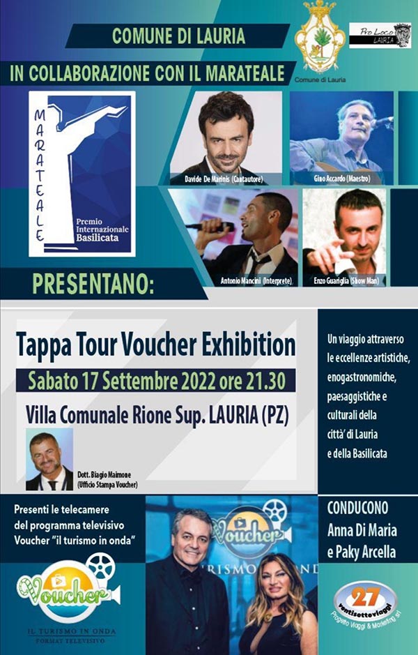 Dall’importanza enorme che riveste il turismo per la Basilicata nasce l’incontro con “Voucher Exhibition – Il Turismo in onda”, trasmissione televisiva realizzata e condotta da Anna Di Maria e Paky Arcella, i quali faranno tappa a Lauria, splendida Città montuosa e fonte inestinguibile di acqua, come testimoniano i suoi torrenti, ricca di verde e di storia, situata in provincia di Potenza.