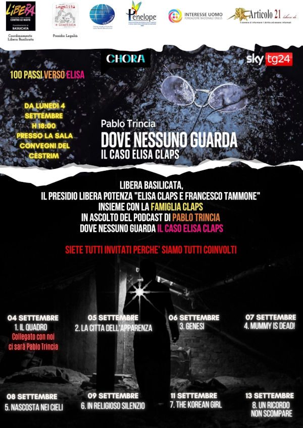 A partire dal 4 settembre e fino al 13 (tutte le sere fatta eccezione domenica 10 e il 12 per la presentazione del libro ‘Sono io Elisa Claps’) alle ore 18.00 nella sala convegni del Cestrim a Potenza, ci riuniremo con la famiglia Claps per ascoltare tutte le puntate del podcast.