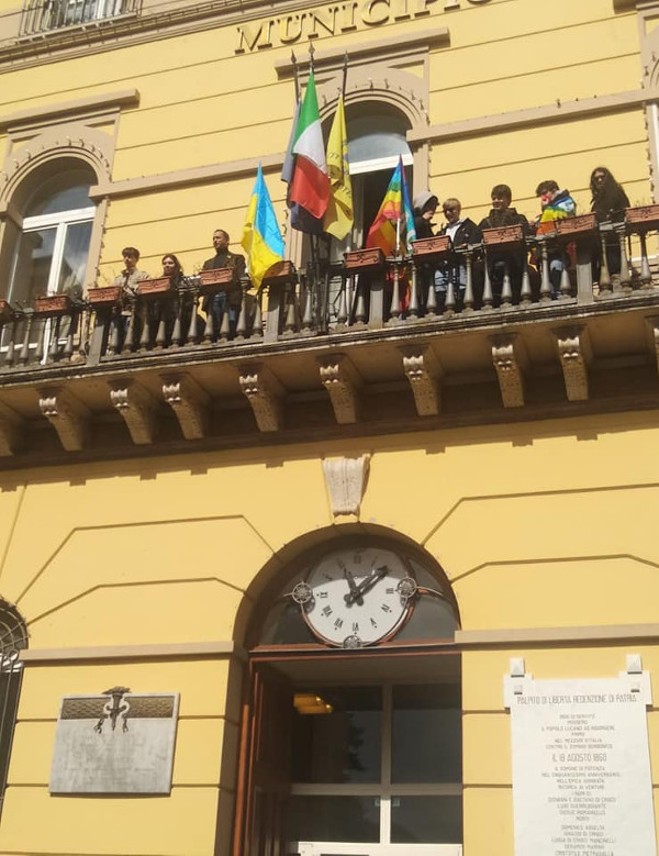 Insieme ai rappresentati d’istituto abbiamo, poi, issato la bandiera della pace e quella dell’Ucraina sul balcone del Municipio.