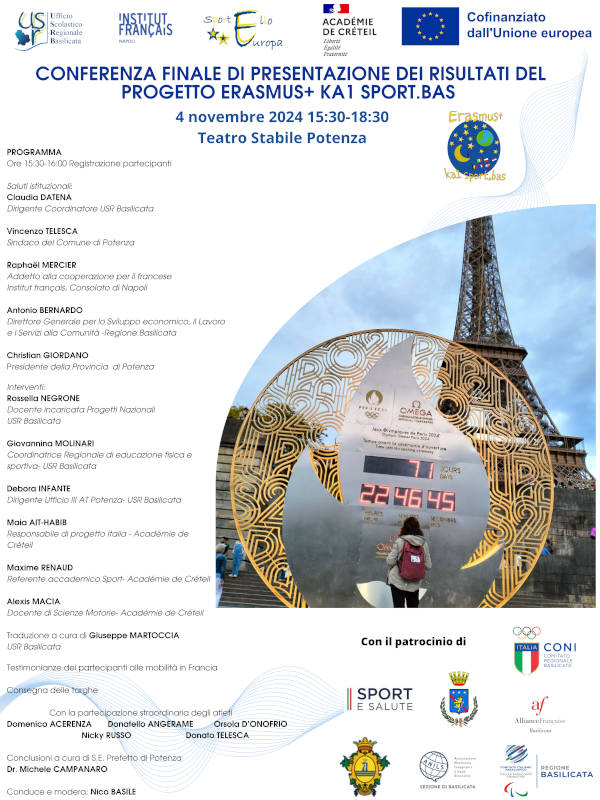 Il 4 novembre, dalle ore 15.30 alle ore 18:30, presso il Teatro Stabile di Potenza, si terrà la conferenza finale di presentazione dei risultati del consorzio Erasmus+ SPORT.BAS, promosso dall’ Ufficio Scolastico Regionale per la Basilicata (USR), in qualità di coordinatore del progetto.