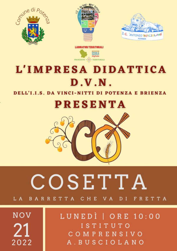 Per ulteriori informazioni e aggiornamenti si può visitare il sito dell’IIS L da Vinci Nitti www.davinci-nitti.edu.it che nella home page ospita post aggiornati di tutti gli eventi legati a ‘Cosetta'”.