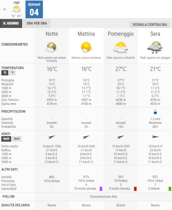 Secondo gli esperti di 3bmeteo, domani, Martedì 4 Luglio, avremo cieli in prevalenza poco nuvolosi, con nubi in aumento dal pomeriggio fino a cieli nuvolosi o molto nuvolosi con deboli piogge in serata.