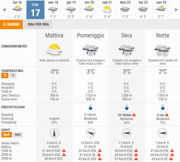 Di seguito la situazione prevista nei prossimi giorni con in dettaglio la giornata di domani Martedì 17 Gennaio (Fonte: 3Bmeteo).