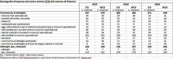 Sempre a Potenza gli esercizi commerciali al dettaglio in attività nel centro storico erano 437 nel 2012 per poi diminuire a 392 nel 2018 sino agli attuali 371; nel “non centro storico” sono passati da 479 (2012) a 462 (2018) sino agli attuali 449.