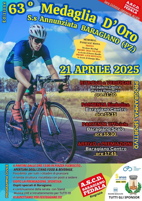 Lunedì 21 aprile si corre a Baragiano la classicissima giovanile di Pasquetta intitolata alla memoria di Pasquale Massa, Donato Russillo, Giuseppe Mitro e Nicodemo Macrifugi (compianto presidente del comitato regionale Basilicata della Federciclismo).