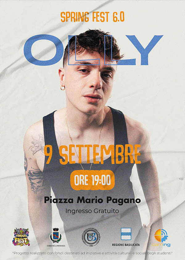 L’Associazione Culturale Universitaria “CAMING” è lieta di invitare i cittadini al concerto conclusivo del progetto “Spring Fest 6.0” che si terrà in data 9 Settembre 2023 dalle ore 19:00 presso Piazza Mario Pagano, il cui assoluto protagonista sarà il cantante OLLY.