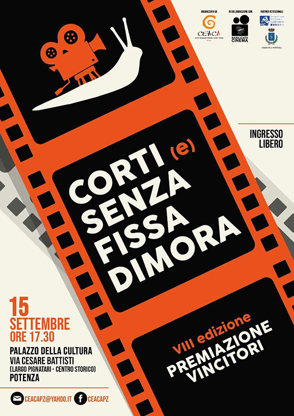 collaborazione con BasilicataCinema e con il Patrocinio del Ministero della Cultura e del Comune di Potenza, organizza la Cerimonia di Premiazione VIII edizione del Concorso Cinematografico Corti (e) Senza Fissa Dimora.