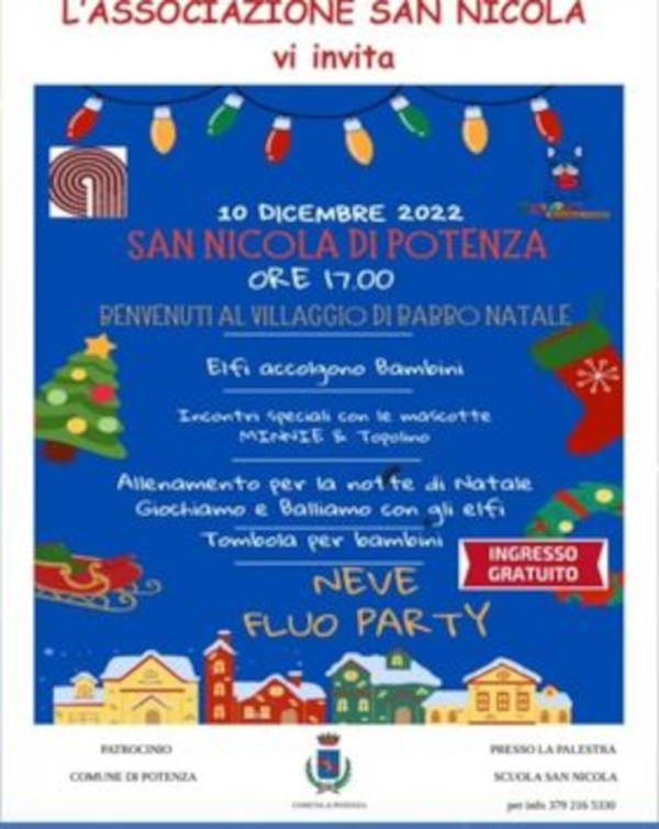 L’associazione San Nicola di Potenza organizza oggi pomeriggio, alle 17.00, nella palestra scolastica a San Nicola una giornata gratuita per i bambini con villaggio di Babbo Natale, mascotte e animazione per fare divertire i più piccoli.