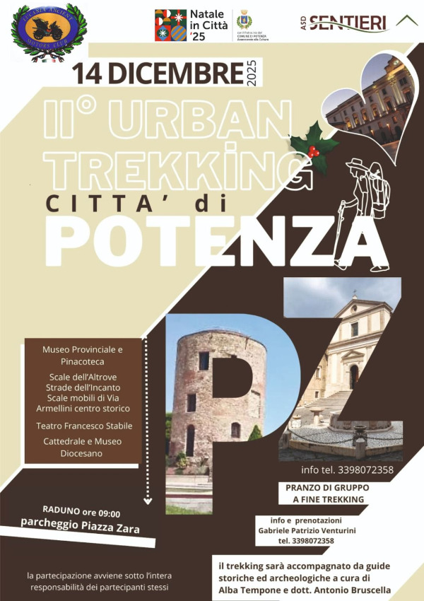 Il Lucania Ancient Motors Club, in collaborazione con l’ASD Sentieri e con il patrocinio della Città di Potenza, nell’ambito delle attività Natale in città 2025, è lieto di annunciare la seconda edizione dell’**Urban Trekking Città di Potenza**, che si svolgerà Domenica 14 Dicembre 2025.