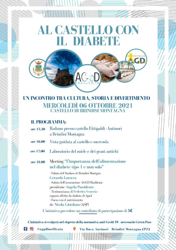 Mercoledì 6 Ottobre, il Castello Fittipaldi-Antinori di Brindisi di Montagna aprirà le sue porte all’Associazione di Genitori e di Giovani Diabetici della Basilicata, per un pomeriggio all’insegna di storia e cultura, ma anche informazione e sensibilizzazione.