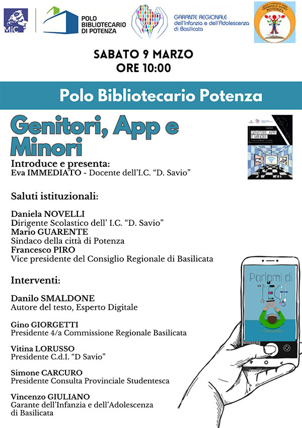 Sabato 9 Marzo 2024 alle ore 10.00 presso il Polo Bibliotecario di Potenza è in programma un incontro sul tema “Genitori, app e minori” organizzato in collaborazione con l’Istituto comprensivo “D.Savio” di Potenza, Dirigente Daniela Novelli.