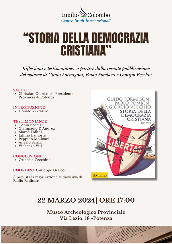 Il Centro Studi Internazionali “E. Colombo” di Potenza ha organizzato, presso la Sala convegni del Museo Archeologico Provinciale (via Lazio, n. 18), per Venerdì 22 Marzo 2024, ore 17.00, un incontro seminariale a più voci sulla storia della Democrazia Cristiana, a partire dalla recente pubblicazione del volume di Guido Formigoni, Paolo Pombeni e Giorgio Vecchio [Bologna, Il Mulino, 2023].