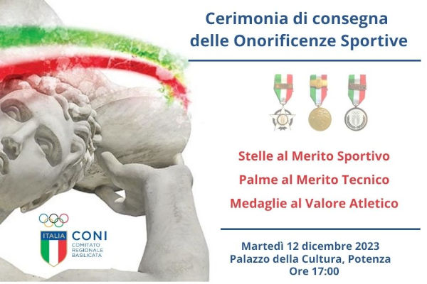 Si terrà martedì 12 dicembre 2023 con inizio alle ore 17:00, presso il Palazzo della Cultura di Potenza in Via Cesare Battisti 22, la Cerimonia di consegna delle Onorificenze Sportive 2021, alla presenza del presidente CONI Basilicata, Leopoldo Desiderio, S.E. il Prefetto di Potenza, dott. Michele Campanaro, il Sindaco e l’assessore allo sport di Potenza, Mario Guarente e Gianmarco Blasi.