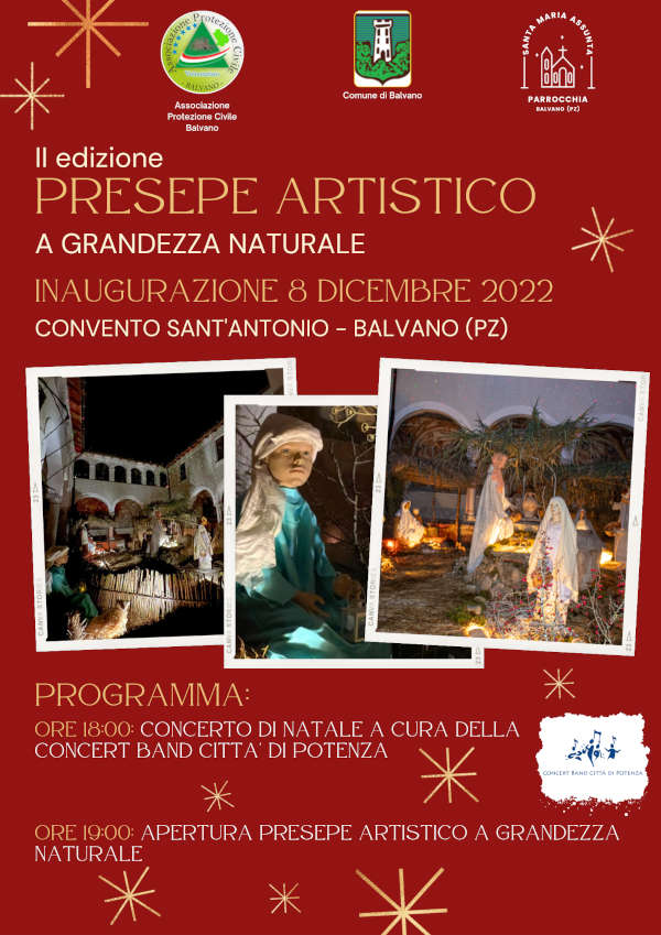 La Parrocchia Santa Maria Assunta di Balvano, in collaborazione con l’Amministrazione Comunale di Balvano e l’Associazione Protezione Civile di Balvano, l’8 Dicembre alle ore 18:00 presso il Convento di S. Antonio di Balvano (PZ), sono lieti di presentare un meraviglioso evento: la II EDIZIONE del PRESEPE ARTISTICO.