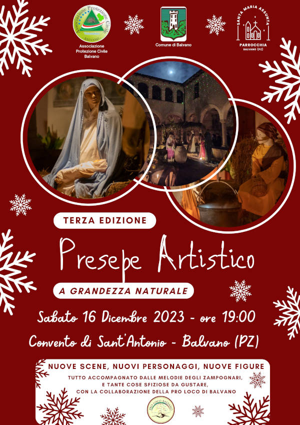 “L’Associazione Protezione Civile di Balvano, in collaborazione con La Parrocchia Santa Maria Assunta di Balvano e l’Amministrazione Comunale di Balvano, il 16 DICEMBRE alle ore 19:00 presso il Convento di S. Antonio di Balvano (PZ), sono lieti di presentare un meraviglioso evento: la III EDIZIONE del PRESEPE ARTISTICO A GRANDEZZA NATURALE.