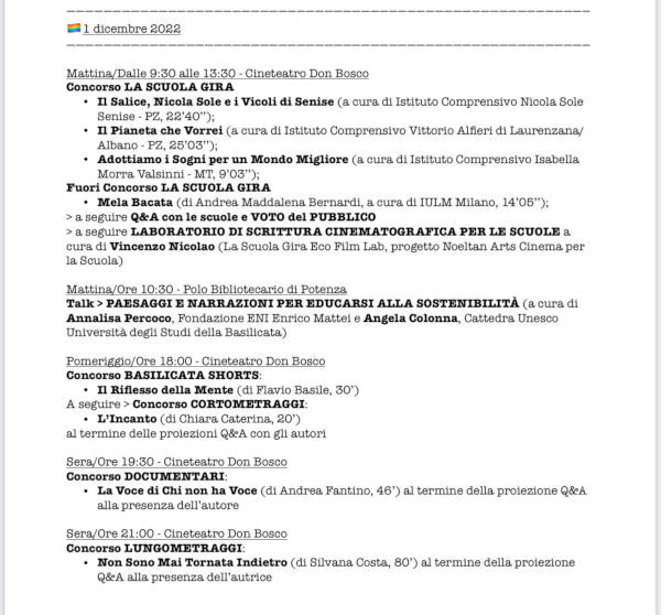 Nelle mattinate, saranno ospitati i corti della sezione ‘La scuola gira’, a opera degli studenti lucani delle scuole di ogni ordine e grado.