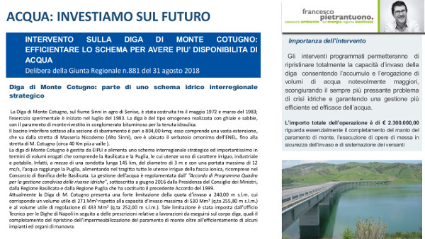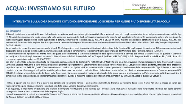 • il secondo, sulla diga di Monte Cotugno, con cui sarà efficientato lo schema per avere più disponibilità di acqua.